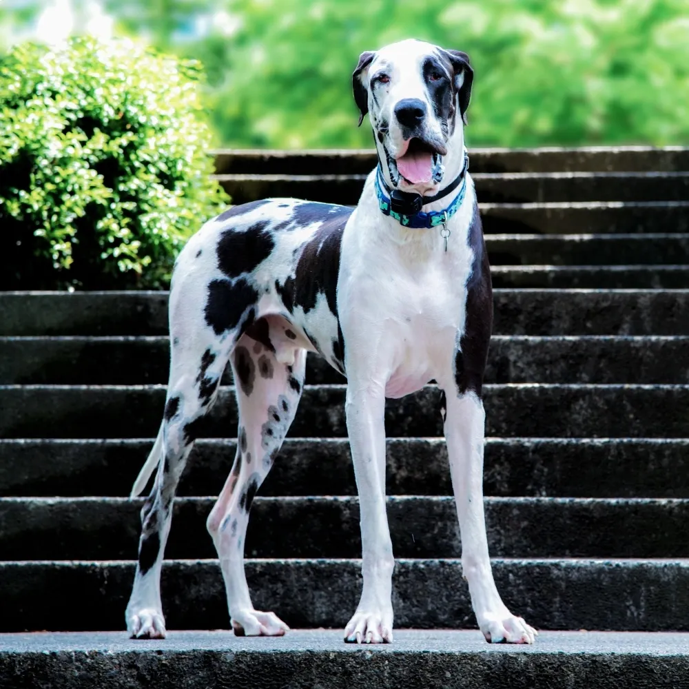 Impossível de confundir, o Dogue Alemão é um cachorro gigante que chama atenção por sua aparência imponente e elegante.