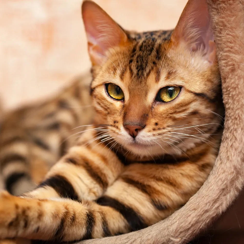 O Bengal é extremamente enérgico e precisa se movimentar todos os dias. Para evitar tédio e comportamentos destrutivos, ofereça arranhadores, prateleiras e brinquedos interativos.