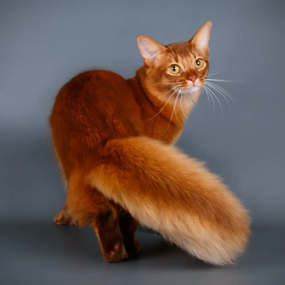 A aparência elegante do Somali sempre chamou atenção, mas foi sua cauda longa, cheia e exuberante que lhe rendeu o apelido "gato-raposa".